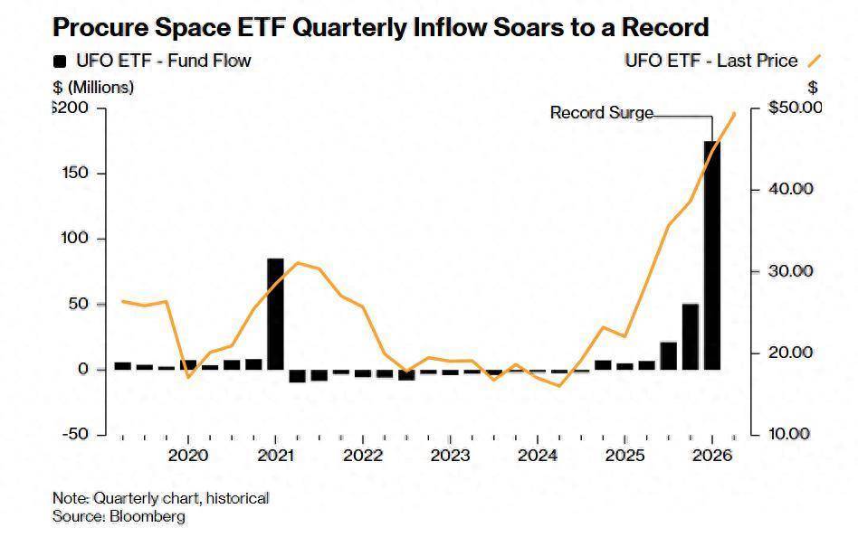 根据机构汇编的一项统计数据,市值约4.15亿美元的Procure Space ETF(美股市场ETF代码:UFO)在今年第一季度吸引了近1.75亿美元资金流入,创下其自2019年成立以来的最大规模资金流入纪录。随着投资者们寻找切入SpaceX——这家从事太空探索、卫星通信和前沿人工智能技术科技巨头且已成为近年来最受期待的首次公开募股公司的投资途径,这股创纪录资金流涌入随之而来。