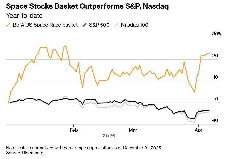 美国银行汇编的一篮子美国太空股票——这些公司是太空竞赛中的关键参与者和潜在受益者——今年已大幅上涨23%,相比之下,标普500指数下跌3.4%,纳斯达克100指数下跌4.2%。