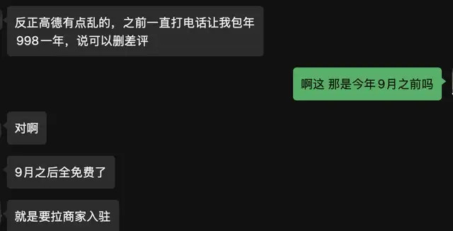 另外,这份号称“永不商业化”的榜单,实则在帮助高德加速商业化。有商家表示,高德的商务人员之前一直向其推销付费产品,给平台缴纳998元可以包年“删差评”。