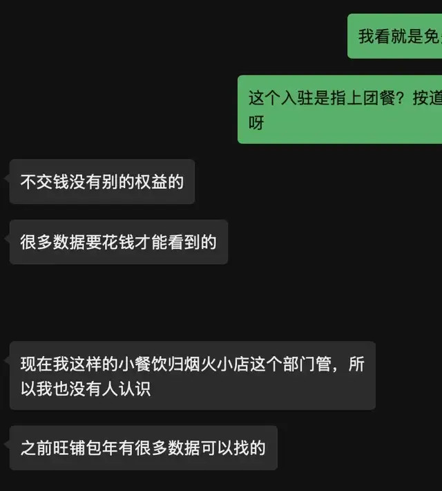 该商家还表示,不给高德交钱就没有别的权益,之前旺铺包年有很多数据可以找,现在小餐馆在高德归烟火小店部门管,很多数据要花钱才能看到。