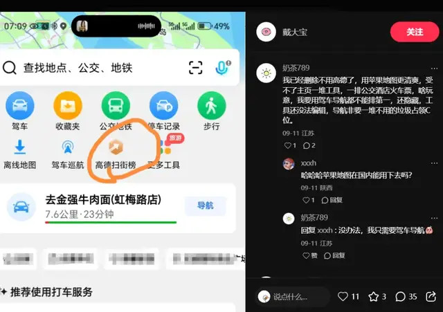 “我已经删除不用高德了,用苹果地图更清爽,受不了主页一堆工具,一排公交酒店火车票,啥玩意,我要用驾车导航都不能排第一,还隐藏,工具还没法编辑,导航非要一堆不用的垃圾占领C位。”