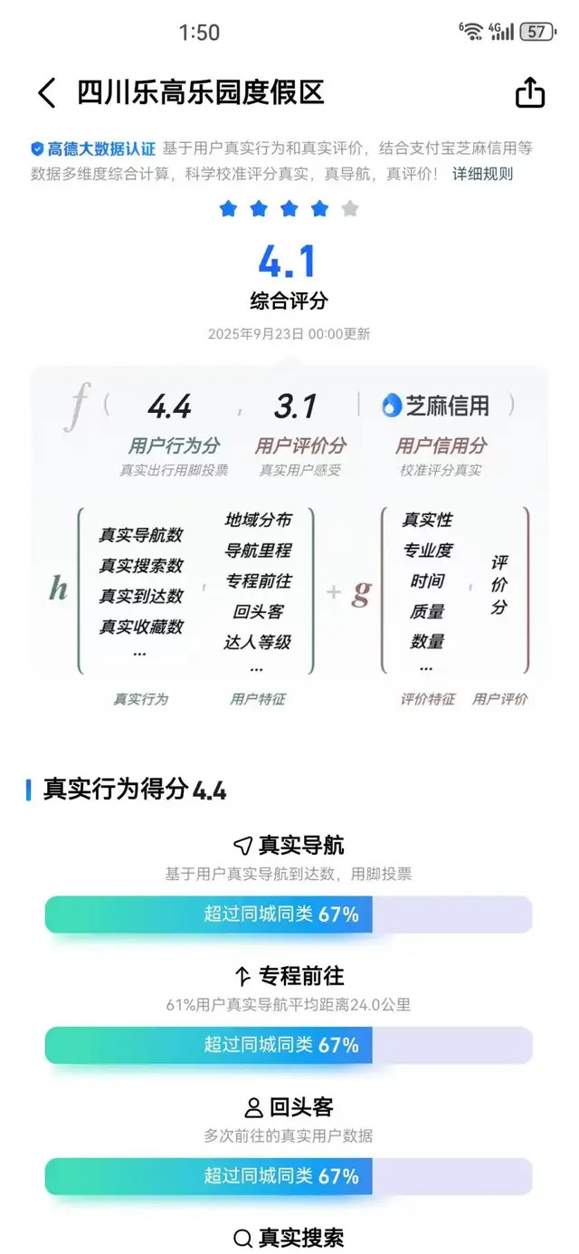 9月23日,司库财经在高德地图上搜索发现:该乐园综合评分为4.1分,真实行为得分为4.4分。而百度百科显示:该项目于2020年6月8日开工建设,开园时间待定。