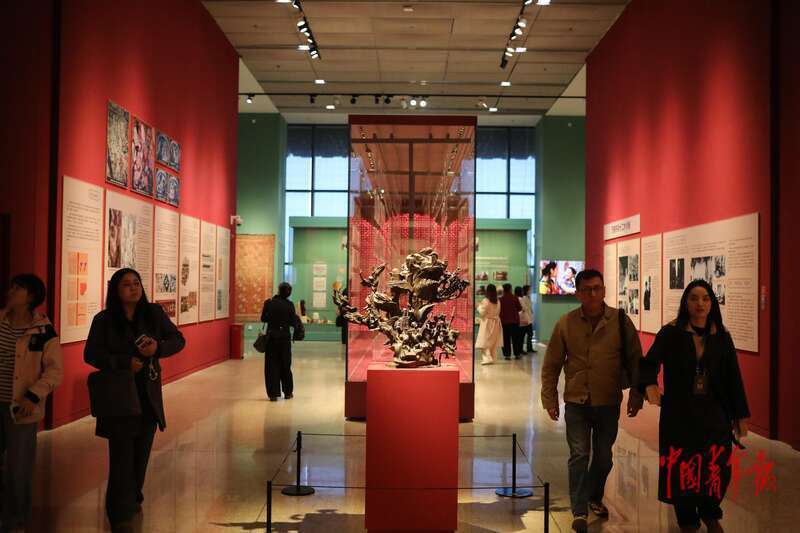 11月2日,北京,中国非物质文化遗产馆,“万方乐奏有于阗 ——新疆和田地区非物质文化遗产展”现场,参观者在展厅中观展。当日,“万方乐奏有于阗 ——新疆和田地区非物质文化遗产展”在中国非物质文化遗产馆开幕,展览共设置昆仑神话、玉出昆冈、丝路名城、万方乐奏、百族骈阗、凝心铸魂六个单元,通过实物展陈、影像播放、技艺演示和互动体验等多种形式,系统呈现和田地区约30项国家级、自治区级非遗代表性项目,展品近600件,重点展出了艾德莱斯绸染织技艺、阿依旺营造技艺、地毯织造技艺、桑皮纸制作技艺等项目。中青报·中青网记者 孔斯琪/摄