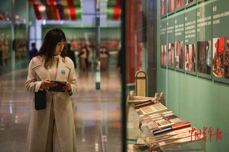 11月2日,北京,中国非物质文化遗产馆,“万方乐奏有于阗 ——新疆和田地区非物质文化遗产展”现场,一名参观者在展厅中观看来自和田的非遗桑皮纸制品。中青报·中青网记者 孔斯琪/摄