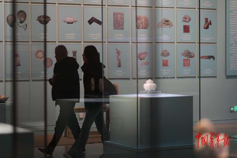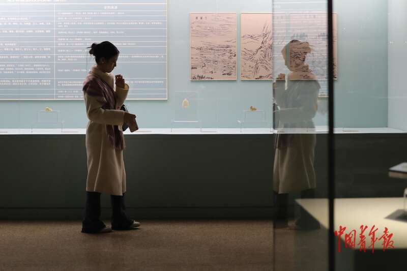 11月2日,北京,中国非物质文化遗产馆,“万方乐奏有于阗 ——新疆和田地区非物质文化遗产展”现场,两名参观者从和田玉相关展区走过。中青报·中青网记者 孔斯琪/摄