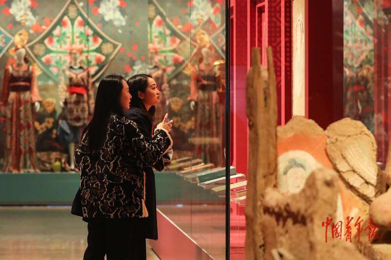 11月2日,北京,中国非物质文化遗产馆,“万方乐奏有于阗 ——新疆和田地区非物质文化遗产展”现场,两名参观者在展厅中观看和田达玛沟佛寺遗址壁画的复原临摹件。中青报·中青网记者 孔斯琪/摄