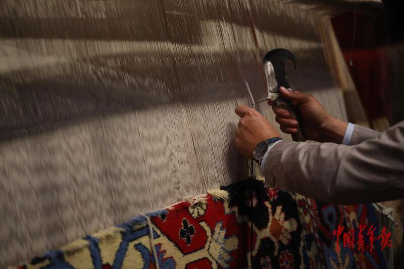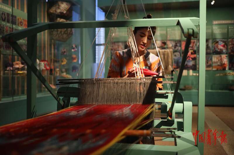 11月2日,北京,中国非物质文化遗产馆,“万方乐奏有于阗 ——新疆和田地区非物质文化遗产展”现场,非遗代表性传承人在展示和田地毯编织技艺。中青报·中青网记者 孔斯琪/摄