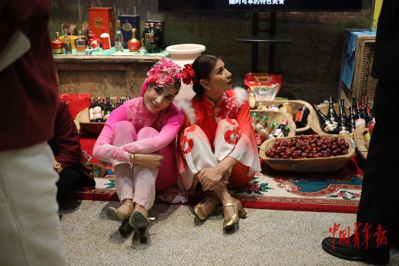 11月2日,北京,中国非物质文化遗产馆,“万方乐奏有于阗 ——新疆和田地区非物质文化遗产展”现场,两名参与表演的舞者在展厅中休息,她们身后摆满了来自和田的特产。中青报·中青网记者 孔斯琪/摄